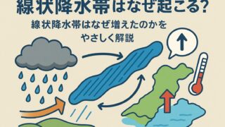 防災・災害 線状降水帯とは簡単に説明!線状降水帯の仕組みについて 近年、ニュースでよく耳にする「線状降水帯」。大雨災害の要因となることが多く、防災上とても重要なキーワードです。しかし「難しそうで理解しにくい」と感じる方も多いのではないでしょうか。この記事では、線状降水帯の定義や仕組み、予測の課題、そして私... 2025.09.26 防災・災害
